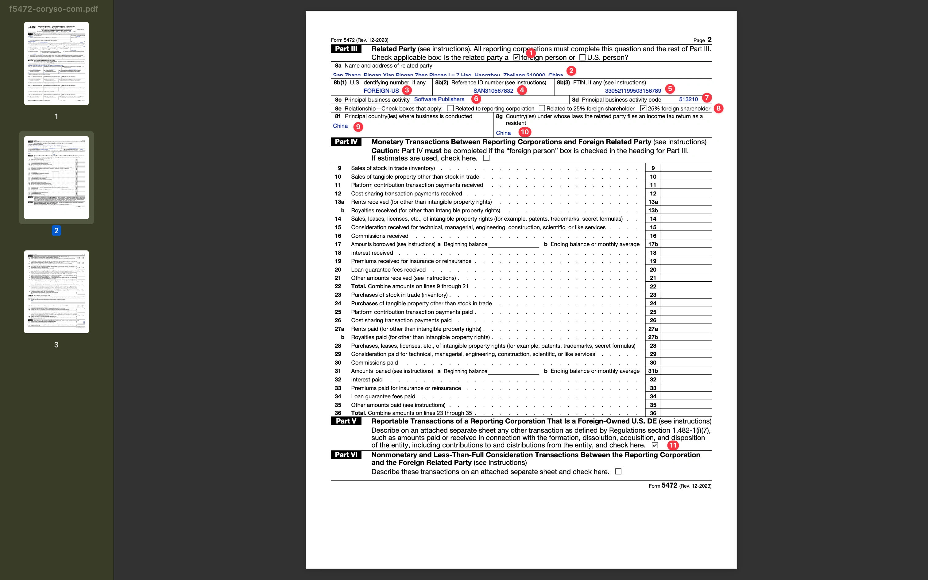 This section mainly fills in related party information. Part III of one Form 5472 can only contain information for one related party.