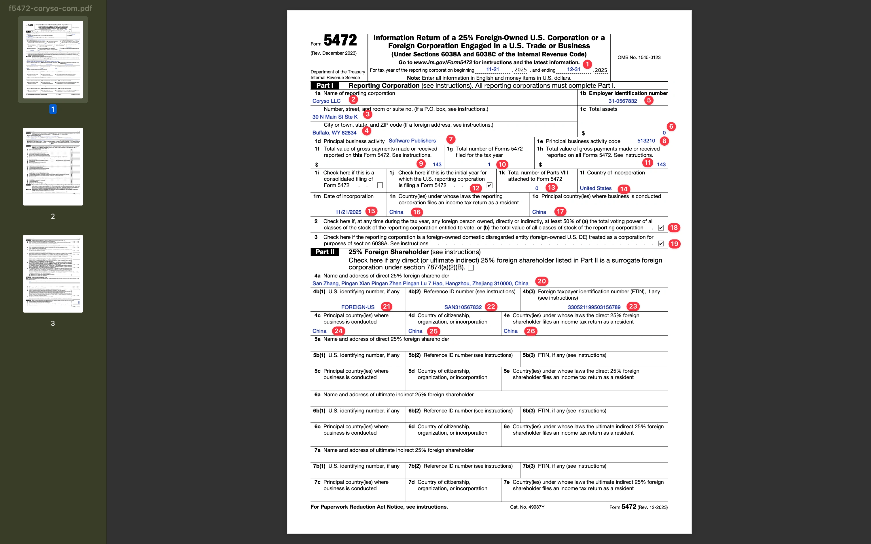 At red dot 23 (i.e., Part II 4b(3)), the shareholder’s foreign taxpayer identification number. For me, this is the Chinese taxpayer identification number, i.e., the ID card number.